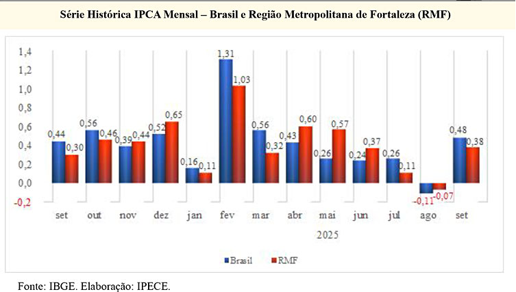 Já o IPCA nacional também apresentou elevação em setembro, fechando em 0,48% contra uma deflação de -0,11% em agosto. No ano, ou seja, de janeiro a setembro, o índice atingiu 3,64% e em 12 meses, 5,17%, que seria um resultado acima do intervalo de tolerância da meta contínua de inflação, de 4,50%. Os índices estão no Termômetro da Inflação (Volume 8 – Nº 10 – Outubro de 2025), publicado pela Diretoria de Estudos Econômicos (Diec) do Instituto de Pesquisa e Estratégia Econômica do Ceará (Ipece).