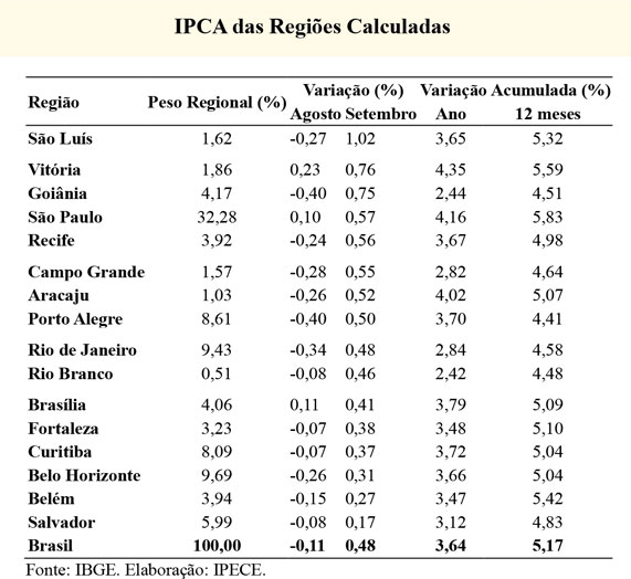 Em setembro, o Índice Nacional de Preços ao Consumidor Amplo (IPCA) da Região Metropolitana de Fortaleza (RMF), após recuar por quatro meses seguidos, acelerou para 0,38%, contra -0,07% (deflação) registrado em agosto. Com a alta no mês passado, a inflação na RMF, de janeiro a setembro, totaliza 3,48% e em 12 meses 5,10%. Os maiores índices, em agosto, foram: São Luís (MA), com 1,02%; Vitória (ES), com 0,76%; Goiânia (GO), com 0,75%, e São Paulo (SP), com 0,57%. A menor inflação foi registrada em Salvador (BA), com 0,17%.