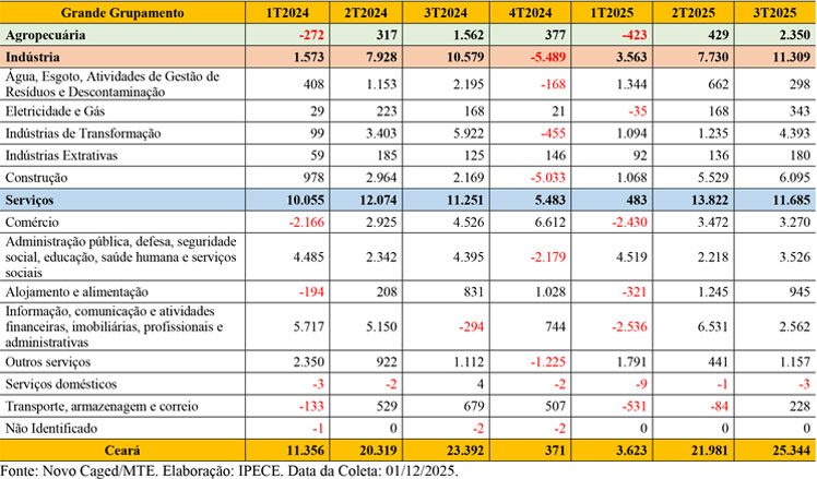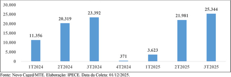 O mercado de trabalho do Ceará, no terceiro trimestre de 2025, criou 25.344 novos empregos (vagas formais, ou seja, com carteira assinada), superando o resultado do ano anterior (julho a setembro), quando foram computadas 23.392 vagas. No acumulado ano, ou seja, de janeiro a setembro, o total de novas vagas no mercado de trabalho formal do Ceará atingiu 50.948. O desempenho evidencia um “comportamento de nítida aceleração no processo de geração de novas vagas no mercado de trabalho formal cearense ao longo do ano e num ritmo mais intenso se comparado ao ano imediatamente anterior”.