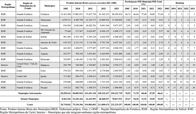 Os dez municípios com maior participação no PIB do Ceará (acima de 1%), em 2023, além de Fortaleza, cujos números já foram mostrados, são: Maracanaú, que passou de uma participação de 6,56% em 2022 para 5,83% em 2023; Caucaia é detentor de 4,25%; São Gonçalo do Amarante, 2,97% ; Sobral, 2,84%; Juazeiro do Norte, com 2,78%; Eusébio, com 3.13%; Aquiraz, 2,09%; Horizonte, 1,28%; Itapipoca, com 1,10% e Crato com 1,05%. Dos dez melhores colocados, seis estão na Grande Região de Fortaleza e três em outras, no caso, Sertão de Sobral; Cariri e Litoral Oeste Vale do Curu.