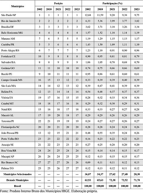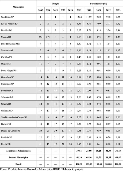 Municípios com maiores PIB do Brasil – 2002, 2010, 2020 e 2021