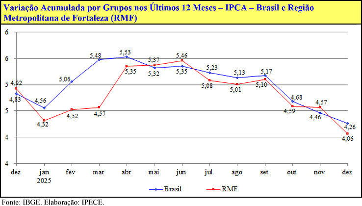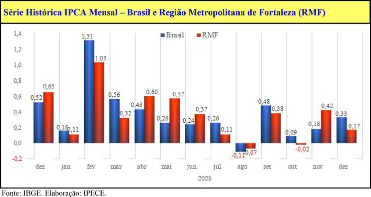 O Índice Nacional de Preços ao Consumidor Amplo (IPCA) da Região Metropolitana de Fortaleza (RMF), em dezembro de 2025, fechou em 0,17%, bem abaixo de 0,42% registrado em novembro. Com isso, a inflação em 2025 (janeiro a dezembro) ficou em 4,06%. O IPCA nacional, no mês passado, atingiu 0,33%, acima do que foi verificado em novembro: 0,18%. No ano, a inflação no Brasil ficou em 4,26%, resultado abaixo do teto estabelecido pelo Conselho Monetário Nacional (CMN). A inflação na RMF, em 2025, foi abaixo do índice nacional.