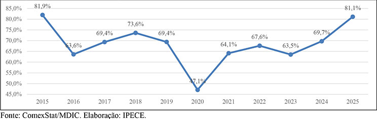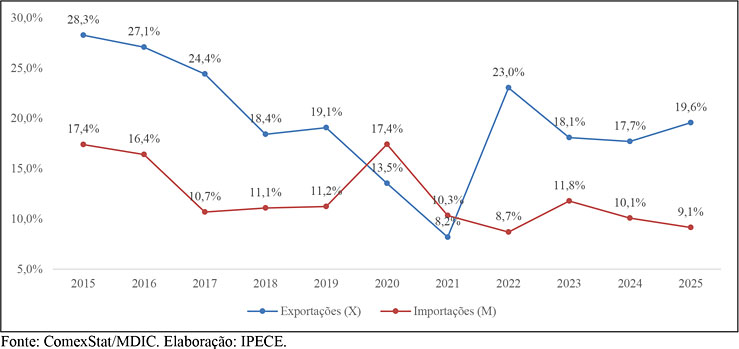 Evolução da Participação das Exportações e Importações Cearenses em Relação ao Bloco Econômico da União Europeia – 2015 a 2025 (%)