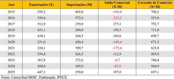 Já as importações cearenses em 2025 totalizaram US$ 250 milhões, valor inferior em 18% em relação a 2024, quando somaram US$ 305 milhões, resultando em perda de participação relativa na pauta de importações de 10,1% em 2024 para 9,1% em 2025. O saldo da baçlança comercial do Ceará ficou em US$ 197 milhões em 2025, contra – US$ 45 milhões de 2024.