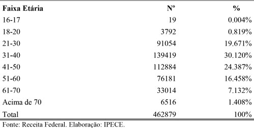 Quanto à análise do registro dos MEI por faixa etária, um estudo do IBGE (2023) mostra que, entre os MEIs formalizados em 2014, apenas 51,6% permaneciam ativos após cinco anos. Além disso, o trabalho evidencia que, quanto mais jovem o empreendedor individual, menores tendem a ser as chances de sobrevivência do empreendimento. Indivíduos entre 31 e 40 anos compõem a maior parcela dos MEIs no Ceará, com 30,12% das inscrições, seguidos pelos grupos de 41 a 50 anos (24,39%) e de 21 a 30 anos (19,67%).