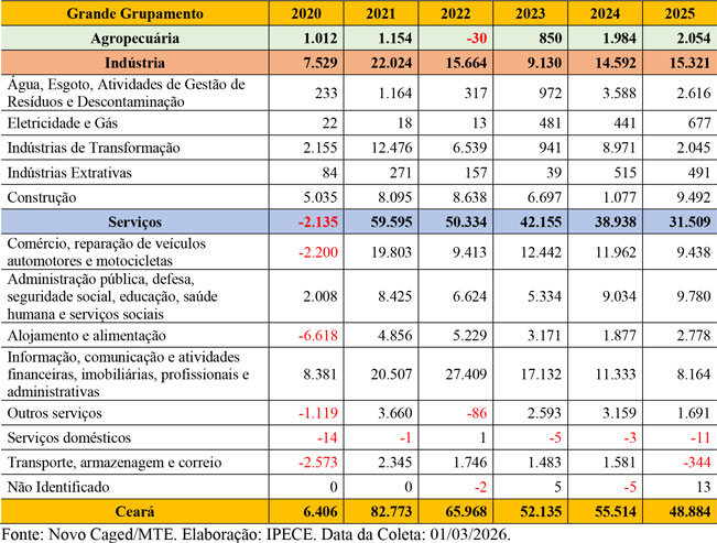 Em 2025, o Ceará gerou um total de 48.884 vagas formais de trabalho (com carteira assinada), ocupando a nona colocação nacional e a terceira posição no Nordeste, atrás apenas da Bahia (94.308 vagas) e Pernambuco (72.349 vagas). Já no acumulado dos últimos três anos, o Ceará foi responsável por um saldo acumulado de empregos formais de 156.533 vagas, ocupando a oitava colocação nacional e a terceira colocação no Nordeste. O Brasil, ano passado, gerou 1.270.545 vagas de trabalho com carteira assinada.
