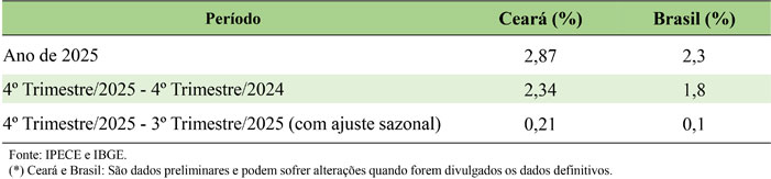 Na análise do 4º trimestre de 2025 em relação ao 4º trimestre de 2024, o PIB cearense registrou um crescimento de 2,34%, enquanto o PIB do Brasil, para a mesma base de comparação, apresentou elevação de 1,8%. Nesta base de comparação, dentre os três grandes setores que compõem a economia cearense, o destaque foi o setor da Agropecuária, que registrou um crescimento de 4,86%, seguido do setor de Serviços (2,57%) e da Indústria (0,59%).