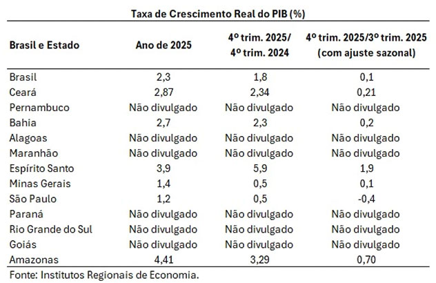 De acordo com Nicolino Trompieri, analista de Políticas Públicas do Ipece e coordenador das Equipe que elabora o PIB do Ceará, a previsão do Instituto para o crescimento da economia cearense no ano de 2026 está em 2,89%. A previsão para o PIB cearense se mantém acima do projetado para o PIB da economia brasileira em 2026, cuja previsão da taxa de crescimento é de 1,83%.