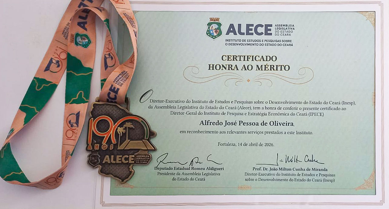 O diretor Executivo do Instituto de Estudos e Pesquisa do Desenvolvimento do Estado de Ceará (Inesp) da Assembléia Legislativa do Estado do Ceará, José Milton Cunha de Miranda, entregou na tarde de ontem (14), por ocasião do evento comemorativo aos 23 anos no Ipece, Certificado Honra ao Mérito (e Medalha), ao professor Alfredo Pessoa, diretor Geral do Ipece “em reconhecimento aos relevantes serviços prestados a este Instituto”. A honraria foi assinada pelo presidente do Legislativo estadual, deputado Romeu Aldigueri, bem como por José Milton.