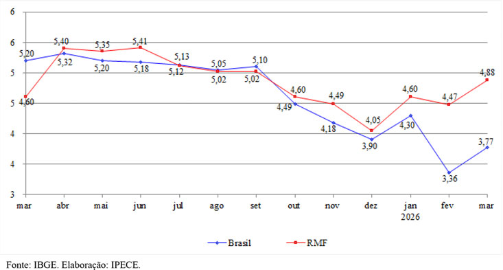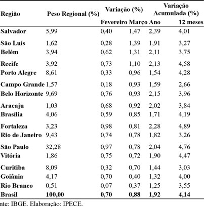 O Índice Nacional de Preços ao Consumidor Amplo (IPCA) da Região Metropolitana de Fortaleza (RMF) recou em março, fechando em 0,81%, contra 0,98% de fevereiro. No ano, a inflação na RMF atingiu 2,28% e em 12 meses, 4,89%. Salvador (Bahia) apresentou a maior inflação em março: 1,47%, seguido por São Luiz (Maranhão), com 1,39%. A menor foi registrada no Rio Branco (Acre): 0,37%. O IPCA nacional ficou em 0,88% em março; no ano, 1,92% e em 12 meses fechou em 4,14%.